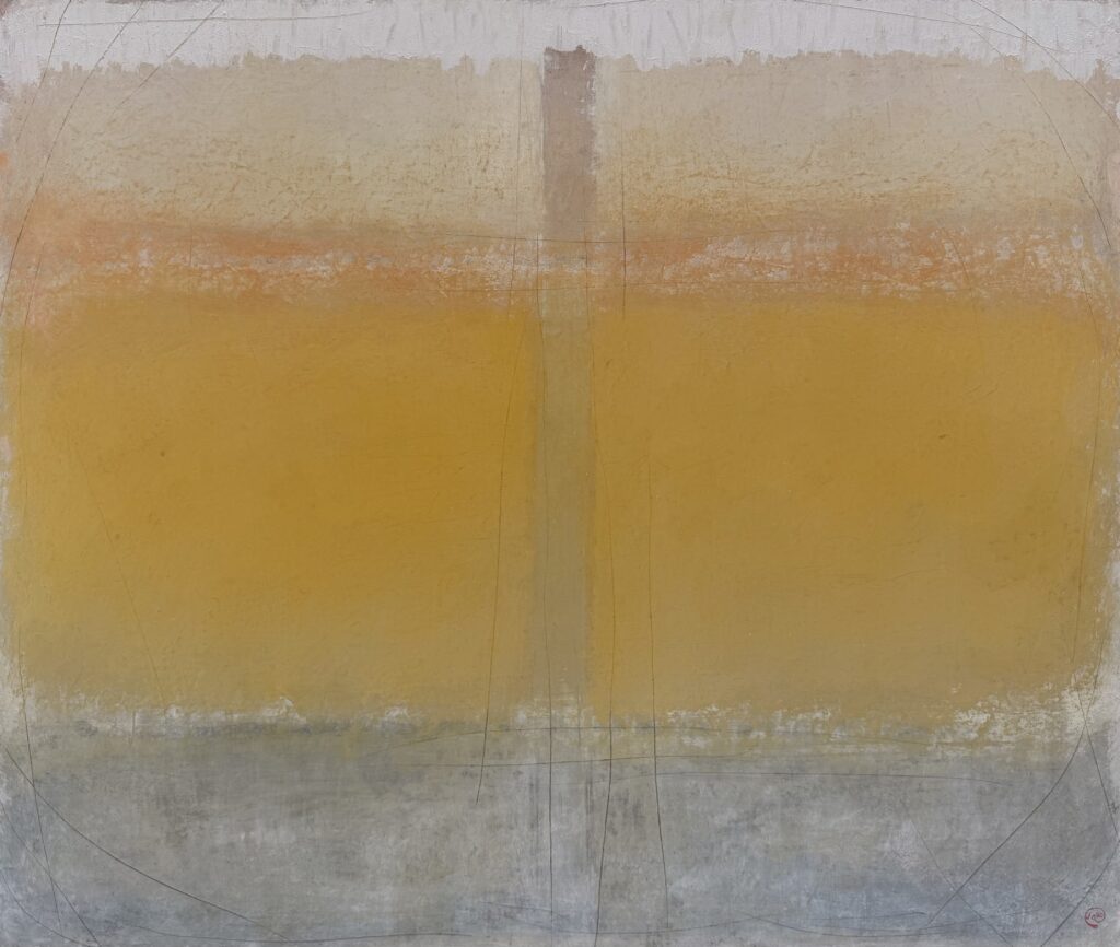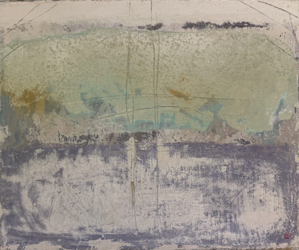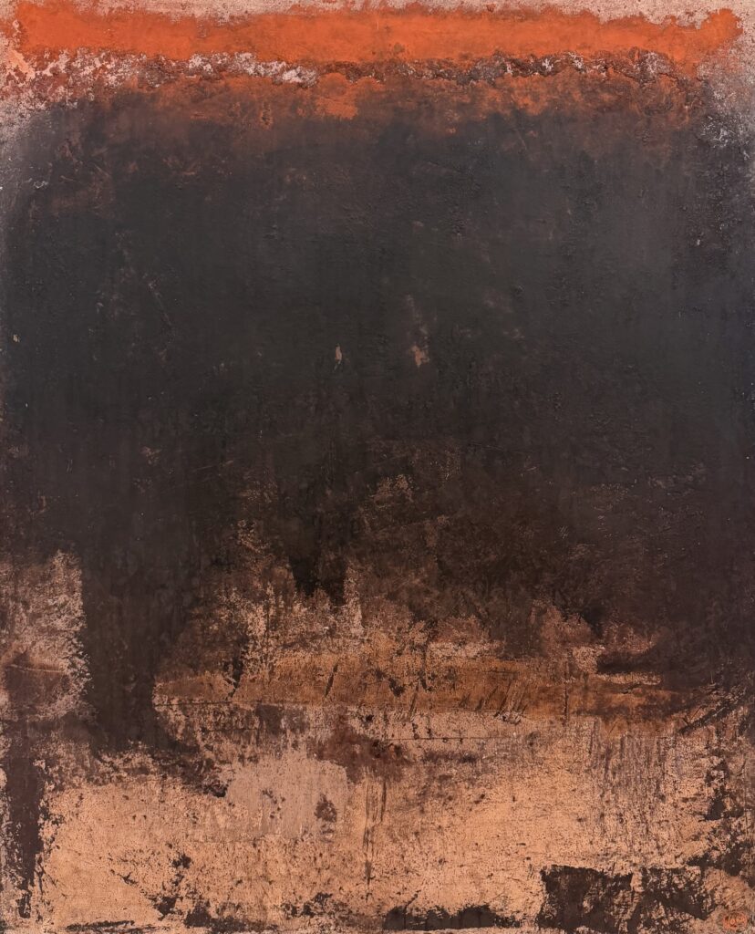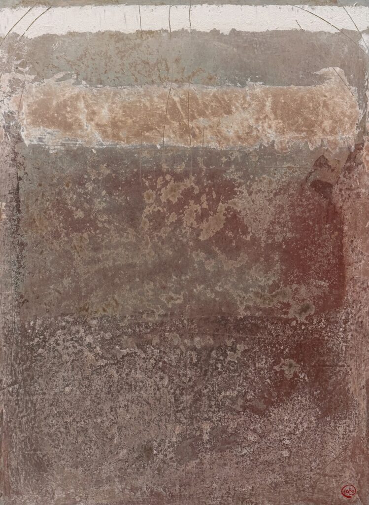 Teokset käsittelevät ajan ja materiaalin muutoksia, wabi-sabi maalauksia öljyvärillä ja väripigmentillä.